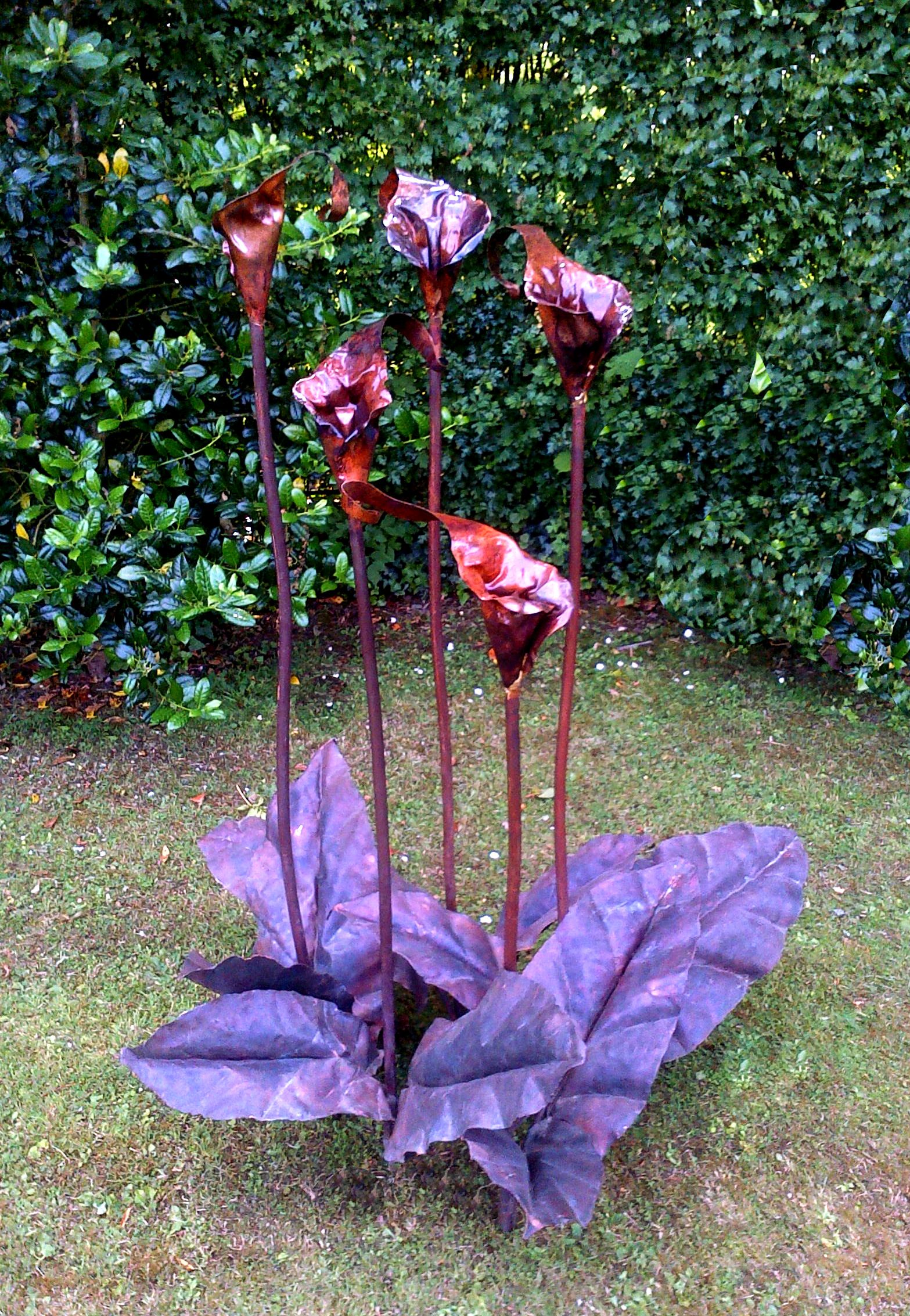 My arum lilies work best in a group of 3 or 5, so that the large richly coloured leaves at the base make a dense mass, competing with each other to collect sunlight. They are life-size, the taller blooms reaching about 150cm in height.