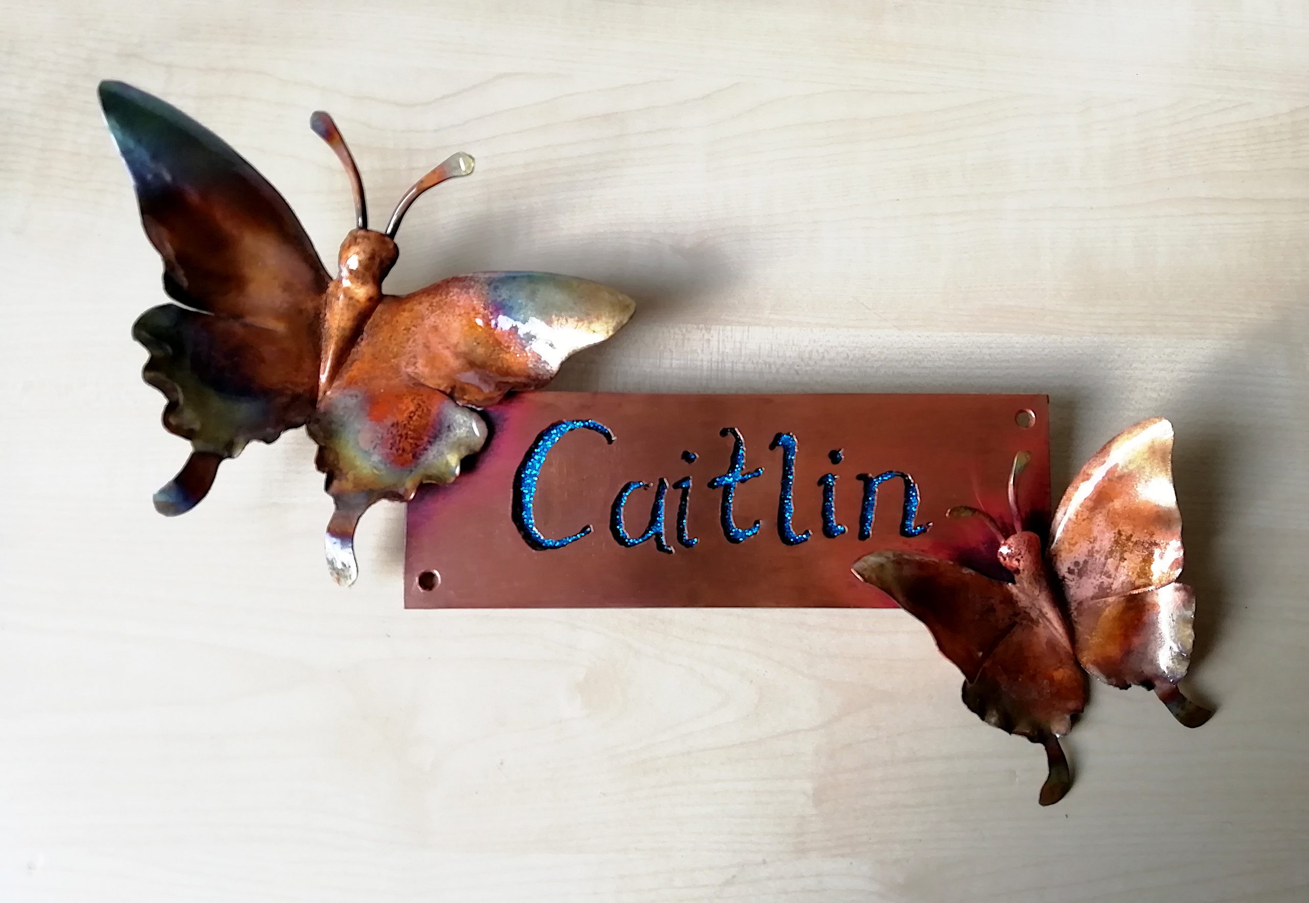 A door name-plate, decorated with two butterflies, and the cut-out lettering decorated with sparkly blue. 38cm wide.